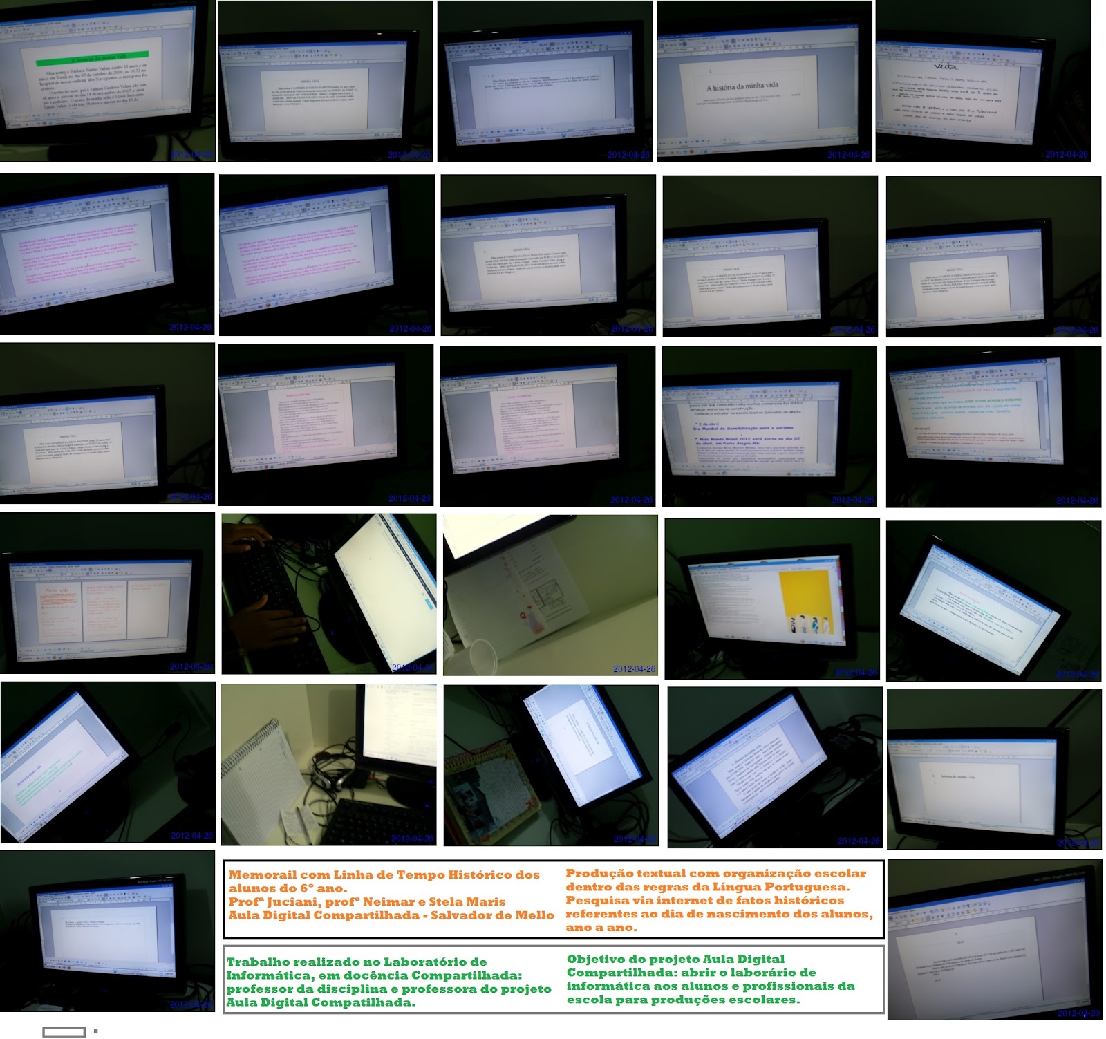 A turma do 6º ano está realizando um trabalho de produção textual chamado "A história da Minha Vida", onde trazem seus dados pessoais de casa e as suas vivências para um registro organizado. Buscando também uma linha de tempo com pesquisa via internet na busca de fatos históricos e/ou importantes a cada data de aniversário, desde o nascimento até o ano de 2012.